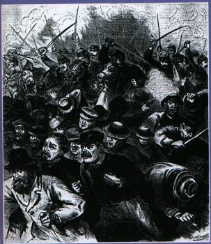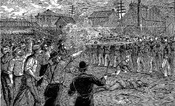 Για μια στιγμή έγινε σιωπή. Μέσα στη νύχτα ακουγόταν ο θόρυβος των ποδιών που έτρεχαν. Ξαφνικά ένα κόκκινο φως έλαμψε και ακούστηκε μια τρομερή έκρηξη. Κάποιος είχε ρίξει μια βόμβα. Ακολούθησε φοβερή σύγχυση. Η αστυνομία πυροβολούσε άγρια προς όλες τις κατευθύνσεις, άνθρωποι έπεφταν στη γη, πολλοί είχαν τραυματιστεί, άλλοι έτρεχαν, έβριζαν, βογκούσαν καθώς τους ποδοπατούσαν ή τους χτυπούσαν με τα γκλομπ οι μανιασμένοι αστυνομικοί, ένας από τους οποίους είχε σκοτωθεί και εφτά ήταν βαριά τραυματισμένοι.