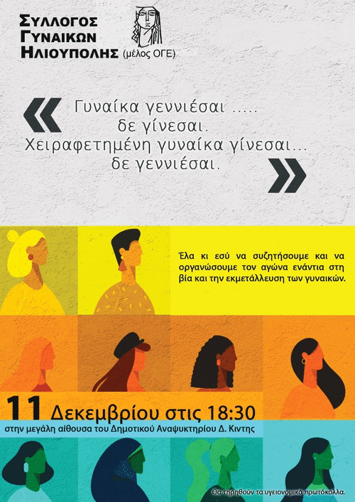 Ο Σύλλογος Γυναικών Ηλιούπολης (μέλος ΟΓΕ) διοργανώνει εκδήλωση – συζήτηση με θέμα «Γυναίκα γεννιέσαι δεν γίνεσαι… Χειραφετημένη γυναίκα… γίνεσαι δεν γεννιέσαι».
