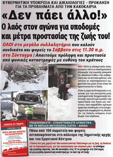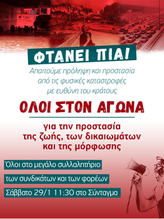 Σε μεγάλη αγωνιστική συγκέντρωση το Σάββατο 29 Γενάρη, στις 11.30 π.μ., στο Σύνταγμα, καλούν συνδικαλιστικές οργανώσεις που δρουν στην Αττική, για την προστασία της ζωής των εργαζομένων και τη διεκδίκηση των σύγχρονων δικαιωμάτων, μετά από κάλεσμα που απηύθυναν εργατικές Ομοσπονδίες, Συνδικάτα, Σωματεία και αυτοαπασχολούμενων