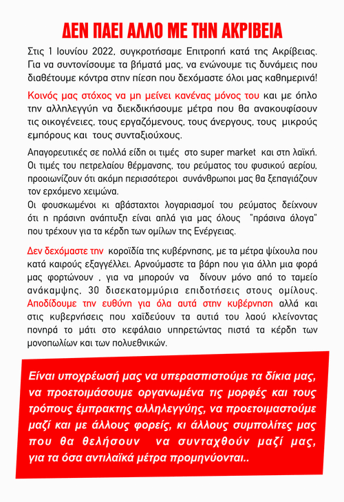 Την 1 Ιουνίου 2022, συγκροτήσαμε Επιτροπή κατά της Ακρίβειας. Για να συντονίσουμε τα βήματά μας, να ενώνουμε τις δυνάμεις που διαθέτουμε κόντρα στην πίεση που δεχόμαστε όλοι μας καθημερινά!