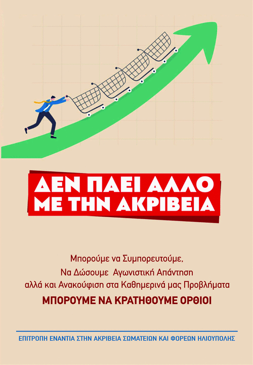 Μετά από Σύσκεψη που πραγματοποίησαν Σωματεία και Φορείς της Ηλιούπολης, αποφάσισαν την δημιουργία «Επιτροπής ενάντια στην ακρίβεια» για να γίνει δυνατή η οργάνωση του αγώνα απέναντι στην ασφυκτική κατάσταση που δημιουργείται στην καθημερινότητα των λαϊκών νοικοκυριών από την ακρίβεια και τις ανατιμήσεις στην ενέργεια, τα καύσιμα και τα αγαθά πρώτης ανάγκης.