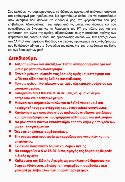 Σας καλούμε να συμπορευτούμε, να δώσουμε αγωνιστική απάντηση απέναντι στα καθημερνά μας προβλήματα. Να κρατηθούμε όρθιοι και να αντισταθούμε στην ακρίβεια που σαρώνει το εισόδημά μας, στη φοροληστεία που μας επιβάλλουν. Αξιοποιώντας την πείρα από τις μάχες που δώσαμε και που συνεχίζουμε να δίνουμε για τη λειτουργία του ΚΥ της πόλης μας και την κατάσταση στο χώρο της υγείας, αξιοποιώντας τους νικηφόρους αγώνες των σωματείων της cosco, e-food, της ομοσπονδίας οικοδόμων, των εργαζόμενων στη ΛΑΡΚΟ, στα πετρέλαια Καβάλας κ.α. με αγώνες προχωράμε σε κοινές δράσεις, που θα δώσουν ώθηση στο δυνάμωμα της πάλης για την υπεράσπιση της ζωής και των δικαιωμάτων μας!