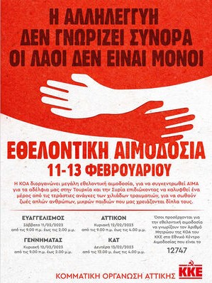 Η Κομματική Οργάνωση Αττικής του ΚΚΕ καλεί τον λαό και την νεολαία της Αθήνας και του Πειραιά να εκφράσουν την αλληλεγγύη τους με κάθε τρόπο προς τους λαούς της Τουρκίας και της Συρίας, που δοκιμάζονται από την ανείπωτη τραγωδία.