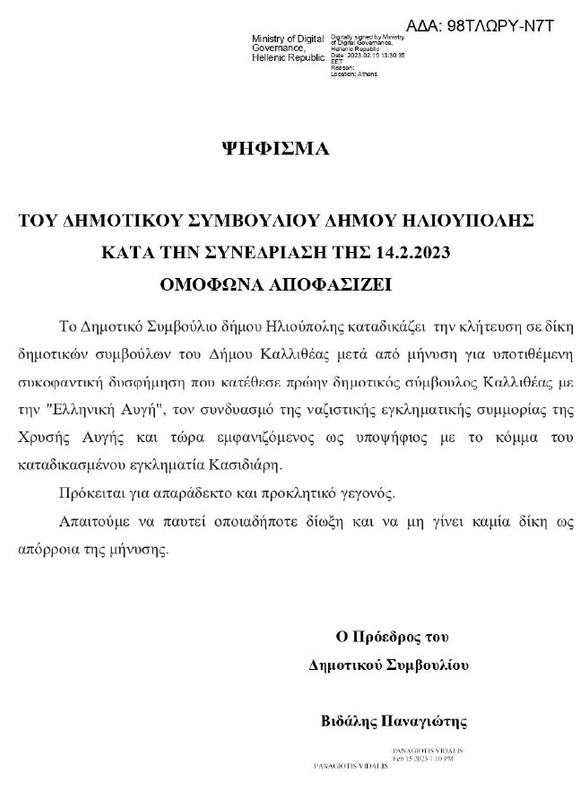 Το Ψήφισμα που κατέθεσε η Λαϊκή Συσπείρωση Ηλιούπολης έγινε ομόφωνα αποδεκτό συνεδρίαση του Δημοτικού Συμβουλίου, στις 14 Φεβρουαρίου 2023, καθώς μέλη του Δημοτικού Συμβουλίου Καλλιθέας καλούνται σε δίκη μετά από μήνυση που κατέθεσε πρώην δημοτικός σύμβουλος Καλλιθέας με την «Ελληνική Αυγή», τον συνδυασμό της ναζιστικής εγκληματικής συμμορίας της Χρυσής Αυγής, και τώρα εμφανιζόμενος ως υποψήφιος με το κόμμα του καταδικασμένου εγκληματία Κασιδιάρη.