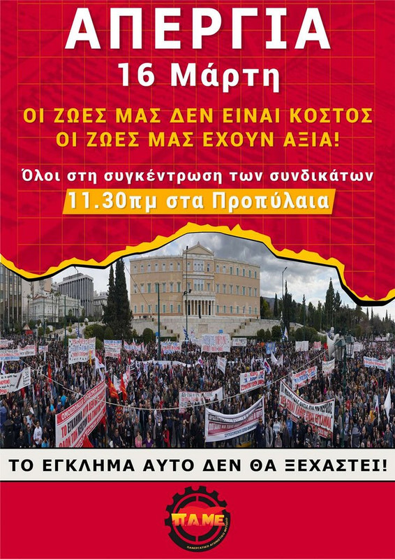 «Απεργία στις 16 Μάρτη. Οι ζωές μας δεν είναι κόστος, οι ζωές μας έχουν αξία!» τονίζει το ΠΑΜΕ σε αφίσα του και καλεί στη συγκέντρωση των Συνδικάτων στις 11.30 π.μ. στα Προπύλαια. «Το έγκλημα αυτό δεν θα ξεχαστεί!», υπογραμμίζει.