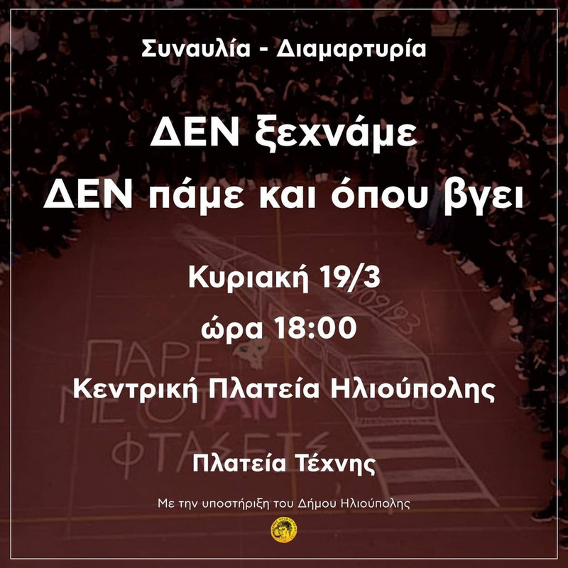 Την Κυριακή 19 Μαρτίου στις 6.00 το απόγευμα στην κεντρική πλατεία Ηλιούπολης, ο νεοσύστατος φορέας πολιτισμού, με έδρα την Ηλιούπολη «Πλατεία Τέχνης», με την συνεργασία των μαθητών από το εργαστήρι τραγουδιού «Λόγω Φωνής», σας καλούν σε μια μουσική διαμαρτυρία για το έγκλημα των Τεμπών. Θα συμμετέχει και το φωνητικό σύνολο του Δήμου Ηλιούπολης.