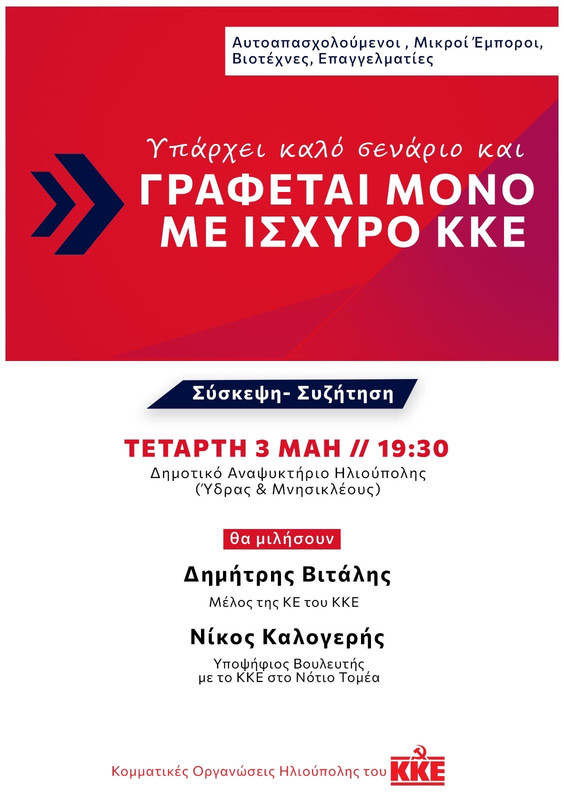 Θα μιλήσουν ο Δημήτρης Βιτάλης (μέλος της ΚΕ του ΚΚΕ και αυτοαπασχολούμενος ΕΒΕ) και ο Νίκος Καλογερής (Ενδοκρινολόγος) Υποψήφιος Βουλευτής με το ΚΚΕ στο Νότιο Τομέα.