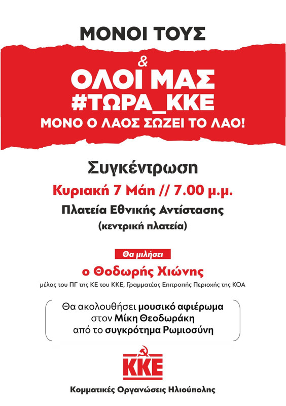 Την Κυριακή 7 Μάη στις 19:00, οι Κομματικές Οργανώσεις Ηλιούπολης του ΚΚΕ διοργανώνουν προεκλογική συγκέντρωση και καλούν το λαό της πόλης, στην πλατεία Εθνικής Αντίστασης (κεντρική πλατεία).