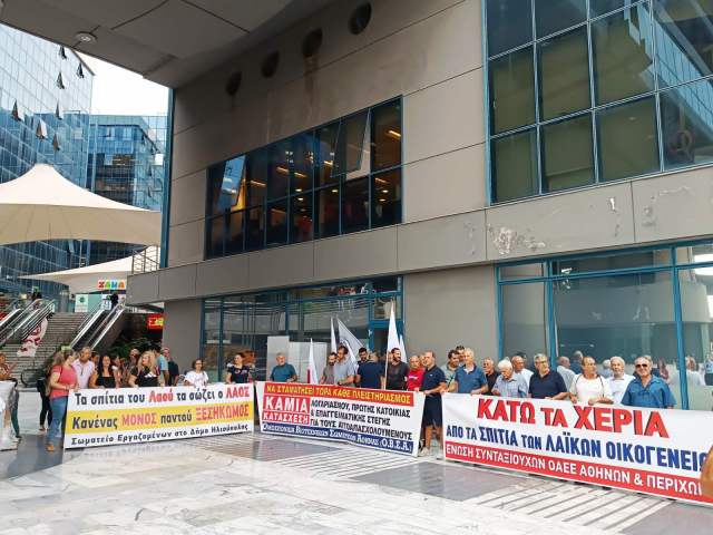 «Τα σπίτια του λαού τα σώζει ο λαός, κανένας μόνος, παντού ξεσηκωμός»: Με το σύνθημα αυτό η Ομοσπονδία Βιοτεχνικών Σωματείων Αττικής (ΟΒΣΑ), η Ένωση Συνταξιούχων ΟΑΕΕ, ο Σύλλογος Εργαζομένων Δήμου Ηλιούπολης και το Συνδικάτο ΟΤΑ Αττικής συγκεντρώθηκαν έξω από τα γραφεία της εταιρείας που διαχειρίζεται «κόκκινα» δάνεια και βγάζει στο σφυρί την πρώτη κατοικία.