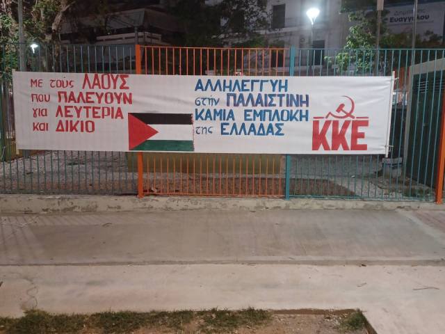 Αναφέρθηκε στο σημερινό έγκλημα στην Παλαιστίνη, που βρίσκεται εδώ και 75 χρόνια σε κατοχή και τώρα ο λαός της βομβαρδίζεται και σφαγιάζεται ανελέητα από το κράτος-δολοφόνο του Ισραήλ, με τις πλάτες ΗΠΑ-ΝΑΤΟ-ΕΕ.