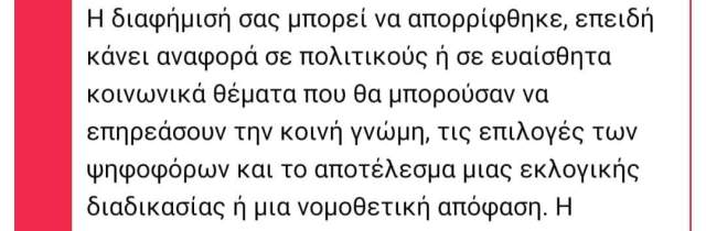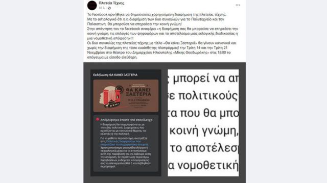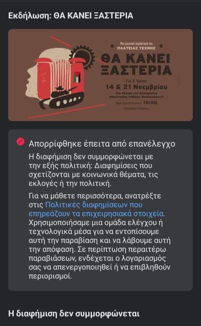 Όπως ενημερώνει σε ανάρτηση η «πλατεία Τέχνης», «το Facebook αρνήθηκε να δημοσιεύσει χορηγούμενη διαφήμιση της πλατείας τέχνης. Με το αιτιολογικό ότι η η διαφήμιση των δυο συναυλιών για το Πολυτεχνείο και την Παλαιστίνη θα μπορούσε να επηρεάσει την κοινή γνώμη! Στην απάντησή του το Facebook αναφέρει «η διαφήμισή σας θα μπορούσε να επηρεάσει την κοινή γνώμη, τις επιλογές των ψηφοφόρων και το αποτέλεσμα μιας εκλογικής διαδικασίας ή μια νομοθετική απόφαση»!!! Οι δυο συναυλίες της πλατείας τέχνης με τίτλο «Θα κάνει Ξαστεριά» θα γίνουν κανονικά και χωρίς τη διαφήμιση της τόσο ευαίσθητης πλατφόρμας! Την Τρίτη 14 και την Τρίτη 21 Νοεμβρίου στο θέατρο του Δημαρχείου Ηλιούπολης «Μίκης Θεοδωράκης» στις 18.00 το απόγευμα με είσοδο ελεύθερη».