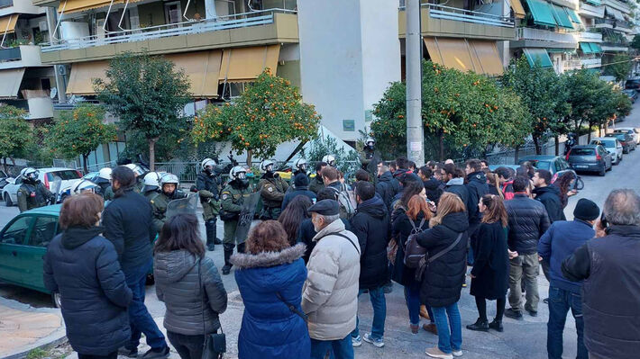 «Κανένας μόνος παντού ξεσηκωμός τα σπίτια του λαού τα σώζει ο λαός» φωνάζουν όσοι έχουν συγκεντρωθεί έξω από το σπίτι της καταγγέλλοντας τη νέα επιχείρηση έξωσης.