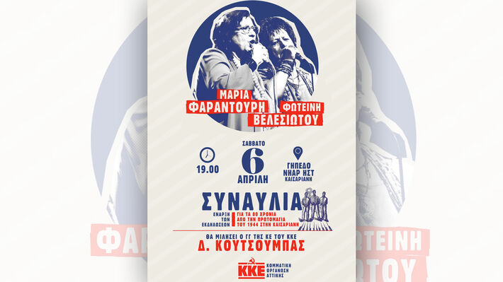 Το Σάββατο 6 Απρίλη, στις 19.00, στο γήπεδο της Νήαρ Ηστ στην Καισαριανή, η Μαρία Φαραντούρη και η Φωτεινή Βελεσιώτου τραγουδούν μαζί και μας «οδηγούν» σε απρόβλεπτα μουσικά κομμάτια. Θα μιλήσει ο ΓΓ της ΚΕ του ΚΚΕ, Δημήτρης Κουτσούμπας. Η είσοδος θα γίνεται με προσκλήσεις που διατίθενται από τις Οργανώσεις του ΚΚΕ και της ΚΝΕ στην Αττική.
