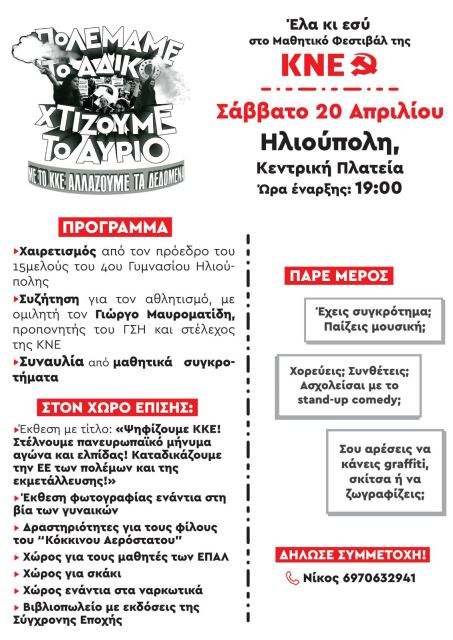 Οι οργανώσεις της ΚΝΕ στην Ηλιούπολη καλούν τους μαθητές, τους φοιτητές ,τους νέους της πόλης στο Μαθητικό Φεστιβάλ που θα γίνει το Σάββατο 20 Απριλίου στις 7μμ στην Κεντρική Πλατεία.