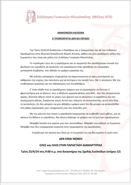 Το Σωματείο Εργαζομένων στην Ιδιωτική Εκπαίδευση Ν. Αττικής «Ο Βύρων» καλεί σε συγκέντρωση διαμαρτυρίας στα δικαστήρια Ευελπίδων την Τρίτη 23 Απριλίου στις 9πμ, τη μέρα που δικάζονται η πρόεδρος, ο γραμματέας του Δ.Σ. και μέλος τους σωματείου. Η εργαζόμενη απολύθηκε γιατί δε δέχτηκε μεταβολή της σύμβασής της και αλλαγή του ωραρίου εργασίας της, το σωματείο βρέθηκε στο πλάι της και τώρα τους περνάνε από δίκη επειδή υπερασπίστηκαν τα δικαιώματα εργασίας της!
