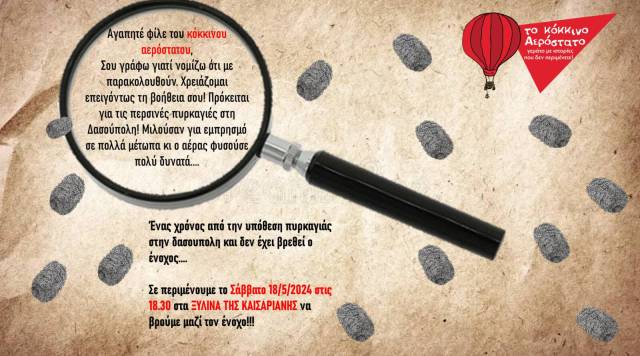 🕵♂️ Ένας χρόνος από την υπόθεση πυρκαγιάς στη Δασούπολη και δεν έχει βρεθεί ο ένοχος…. Σε περιμένουμε το Σάββατο 18/5/2024 στις 18.30 στα Ξύλινα της Καισαριανής να βρούμε μαζί τον ένοχο!!!