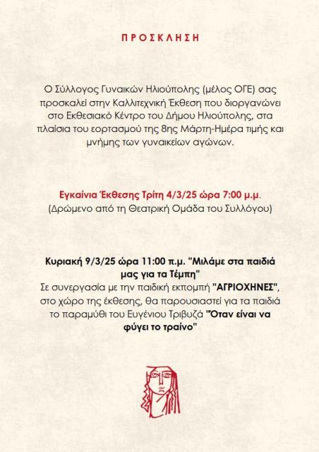 Ο Σύλλογος Γυναικών Ηλιούπολης (μέλος ΟΓΕ) καλεί στην έκθεση που διοργανώνει μπροστά στην 8η Μάρτη, Παγκόσμια Ημέρα της Γυναίκας, με τίτλο:
