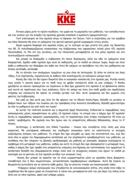 Απέναντι σε αυτήν την πραγματικότητα, εμείς απαντάμε με οργανωμένο αγώνα, συσπείρωση γονιών, μαθητών, εκπαιδευτικών. Να παλέψουμε για σχολείο που να μορφώνει και όχι να εξοντώνει. Να απαιτήσουμε δωρεάν, σύγχρονη, ουσιαστική Παιδεία, με μόνιμους εκπαιδευτικούς, με υποδομές, με πρόγραμμα που να ανοίγει ορίζοντες και όχι να στενεύει το μυαλό.