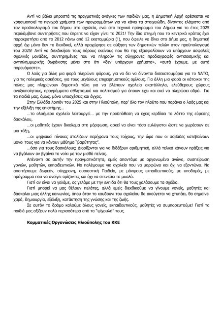 Ο λαός για άλλη μια φορά πληρώνει φόρους, για να δει να δίνονται δισεκατομμύρια για το ΝΑΤΟ, για τις πολεμικές ασκήσεις, για τους μεγάλους επιχειρηματικούς ομίλους. Για άλλη μια φορά οι κάτοικοι της πόλης μας πληρώνουν δημοτικά τέλη για να βλέπουν σχολεία ακατάλληλα, ελεύθερους χώρους αναξιοποίητους, προγράμματα αθλητισμού και πολιτισμού για όποιον έχει και εκεί να πληρώσει αδρά. Για τα παιδιά μας, όμως, μόνο υποσχέσεις και άγχος.
