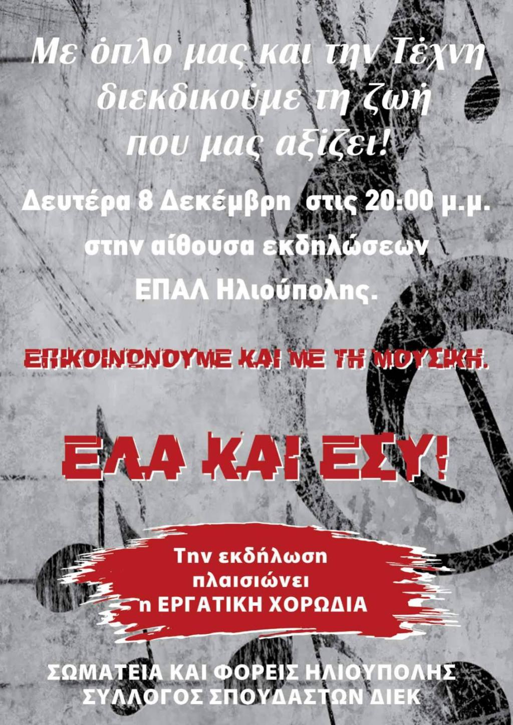 Σωματεία και Φορείς της Ηλιούπολης από κοινού με τον Σύλλογο Σπουδαστών ΣΑΕΚ διοργανώνουν συναυλία με την εργατική χορωδία τη Δευτέρα 8 Δεκεμβρίου στις 8μμ στην αίθουσα εκδηλώσεων του ΕΠΑΛ Ηλιούπολης.