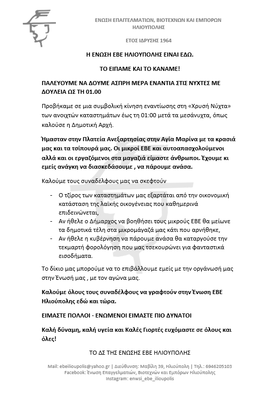 Ένωση ΕΒΕ Ηλιούπολης: Αντί για Λευκή Νύχτα ραντεβού στην Πλατεία Ανεξαρτησίας για τσίπουρο και συζήτηση
