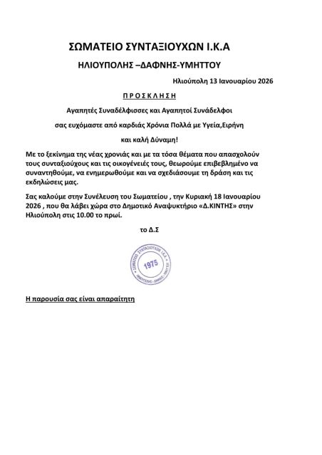 Το Σωματείο Συνταξιούχων ΙΚΑ Ηλιούπολης, Δάφνης, Υμηττού καλεί στην πρώτη Γενική Συνέλευση της χρονιάς την Κυριακή 18 Ιανουαρίου 2026 στο Δημοτικό Αναψυκτήριο «Δ. Κιντής».