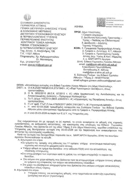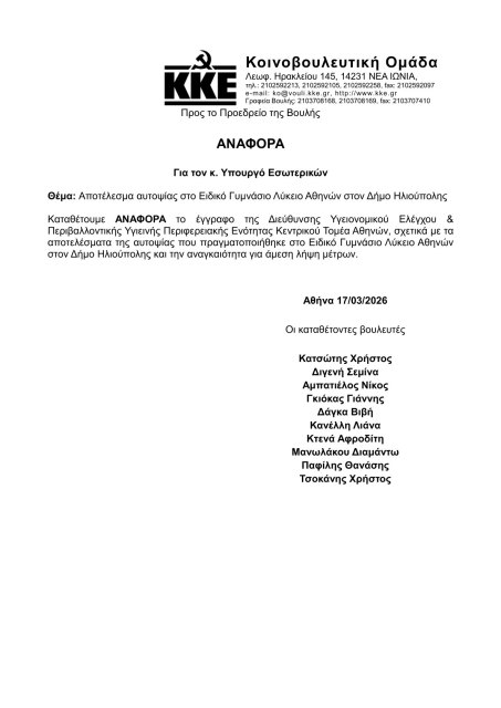 Σήμερα Τρίτη 17/3/26 βουλευτές του ΚΚΕ κατέθεσαν αναφορά στη βουλή σχετικά με το αποτέλεσμα αυτοψίας στο Ειδικό Γυμνάσιο Λύκειο Αθηνών στον Δήμο Ηλιούπολης που επιβεβαιώνει την ακαταλληλότητα και επικινδυνότητα του σχολείου.